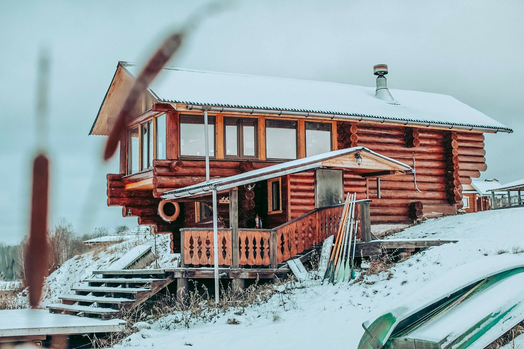 Баня построена в 2 этажа с панорамными окнами с видом на озеро.