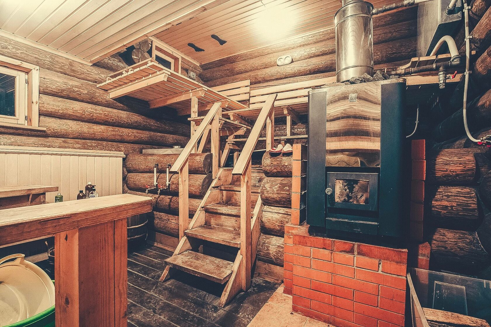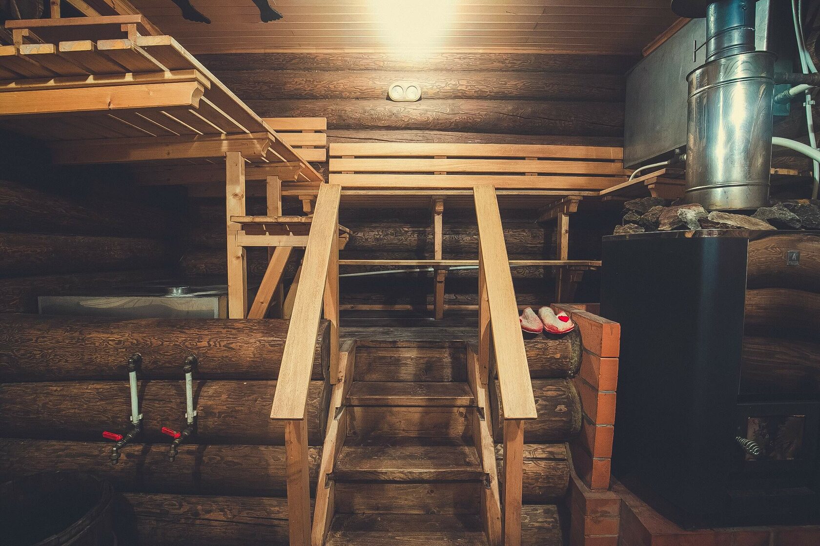 В бане расположена трехярусная парильная комната.